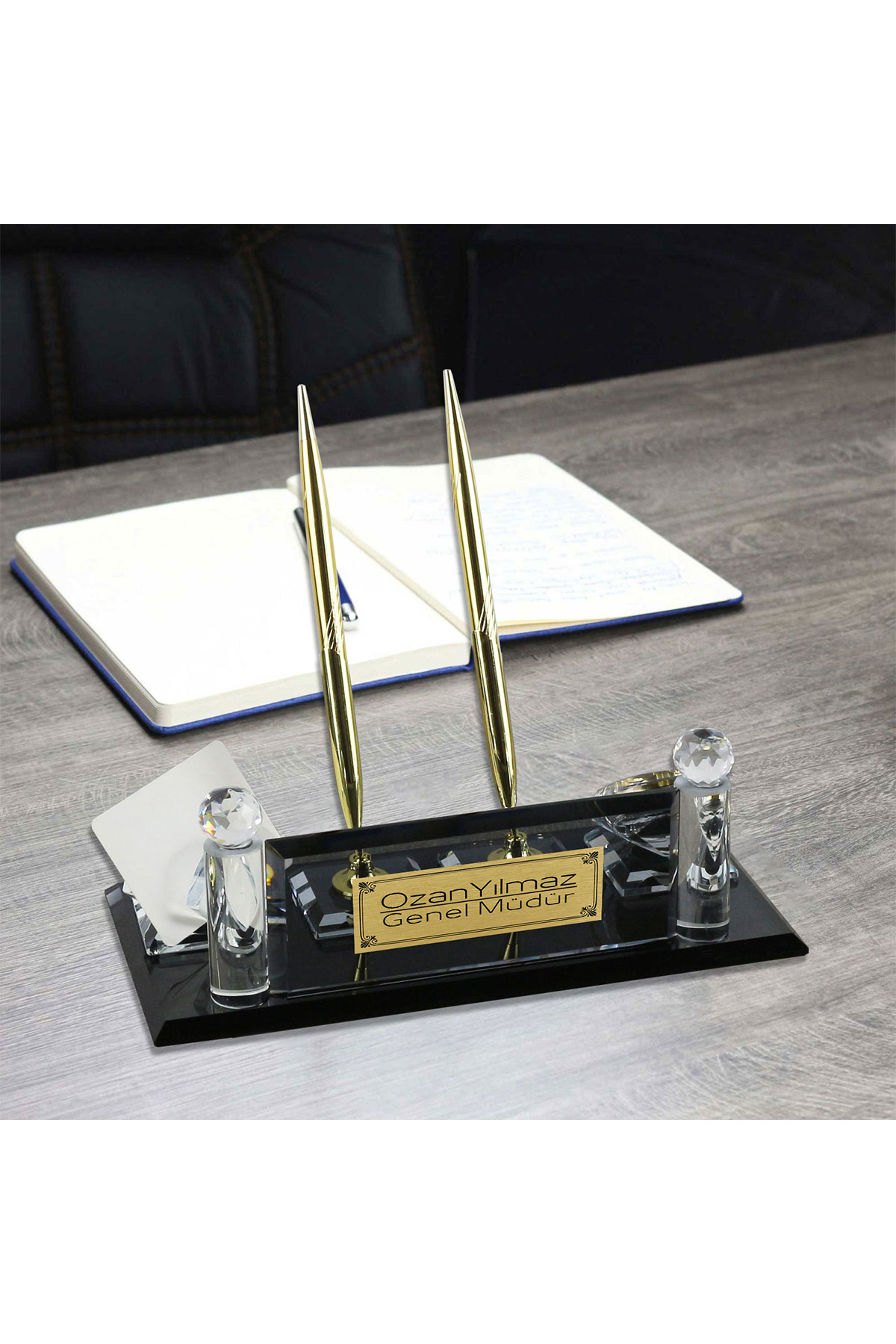 Şık ve zarif tasarımıyla dikkat çeken cam masaüstü isimlik setimiz, çalışma alanınıza hem profesyonel hem de estetik bir dokunuş katıyor. Her biri kişiye özel olarak hazırlanan bu setler, tamamen size özgü hale getirilebilir.