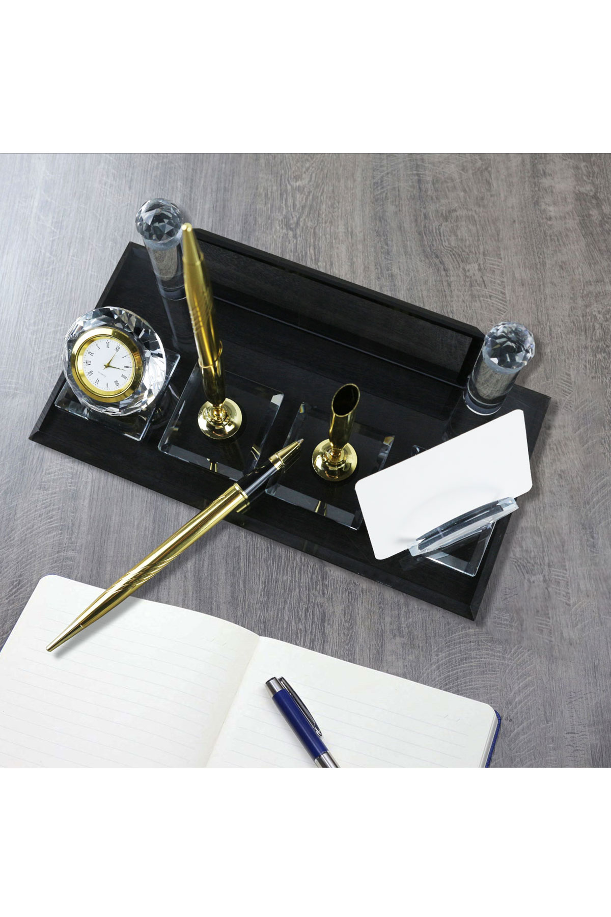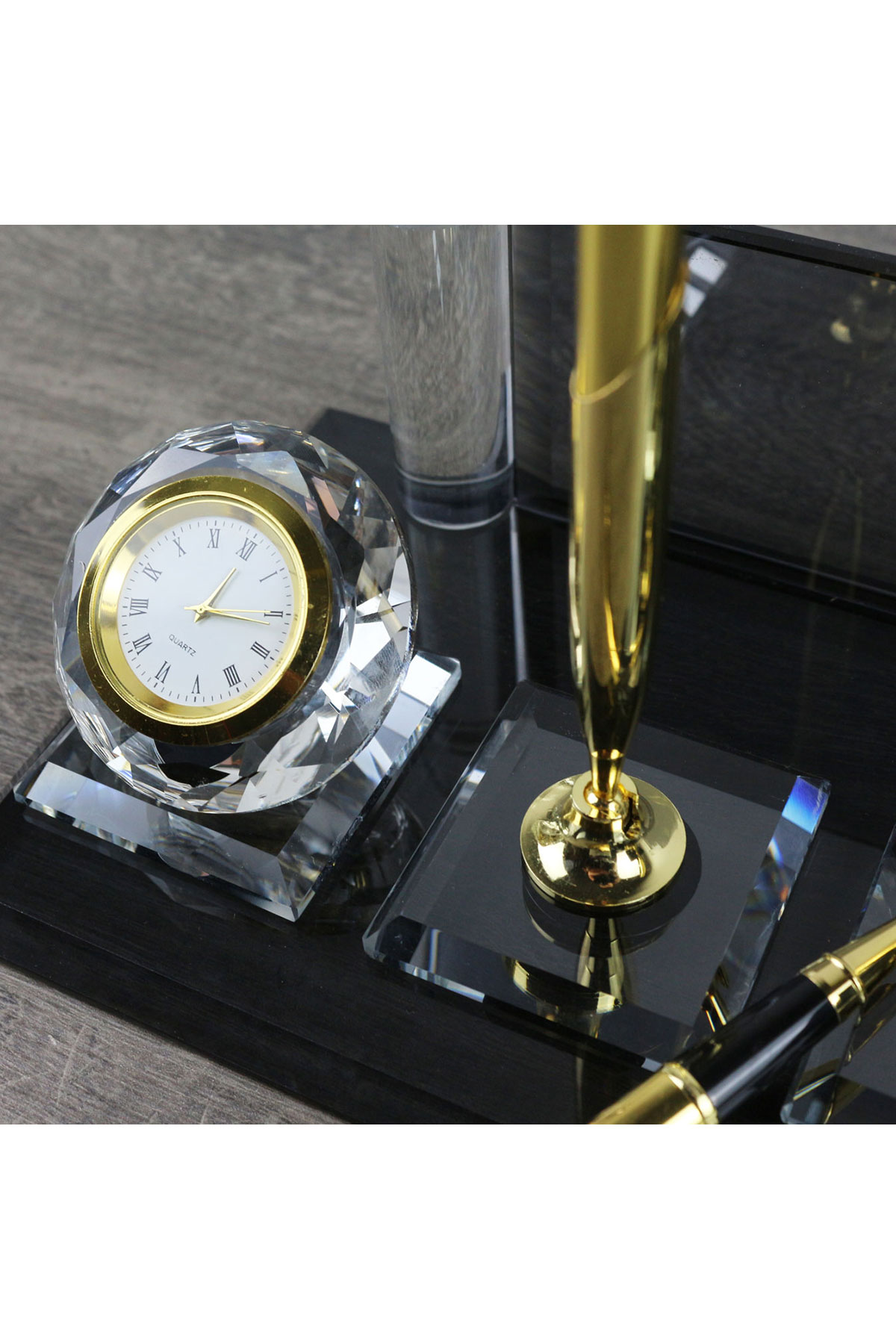 Setimizde yer alan yüksek kaliteli imza kalemi, iş hayatınızda şıklığı ve prestiji bir arada sunar. Elmas şeklinde cam saat kasası içerisinde yer alan quartz saat ise zaman yönetiminizi kolaylaştırırken masanızda zarif bir detay oluşturur. Hem isimlik, hem imza kalemi, hem de quartz saat uzun ömürlüdür.